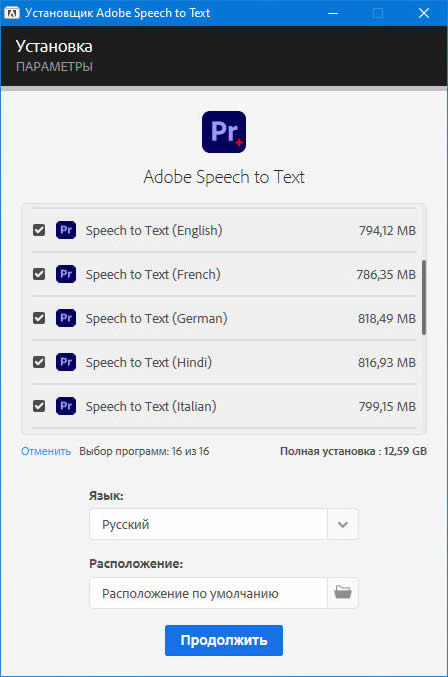 Ответ: Весят они много. Каждый по 800 МБ! Плюс ко всему, изначально ставятся все гуртом. А нужны ли они вам все?! Нужен ли вам дистрибутив Premiere Pro весом больше 15 ГБ, когда большая часть из этого немалого веса вы никогда не будете использовать? Я считаю, что оно того не стоит. Именно поэтому я вынес модули Speech to Text в отдельную сборку и существенно доработал их установочные модули, чтобы их можно было устанавливать по отдельности в соответствии с вашими предпочтениями, а не все сразу.